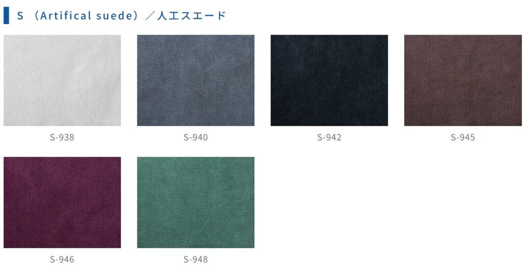 素材もパリっとしたPVC(合成皮革)と、しっとりと肌触りの良い人工スエードから選ぶことができます。人工スエードは東レさんの開発したUltrasuede®(ウルトラスエード)を使用していて、Ultrasuede®は自動車の内装やソファなどの家具にも使用されているので、もしかしたら皆さんも実際に手で触れたことがあるかもしれません。