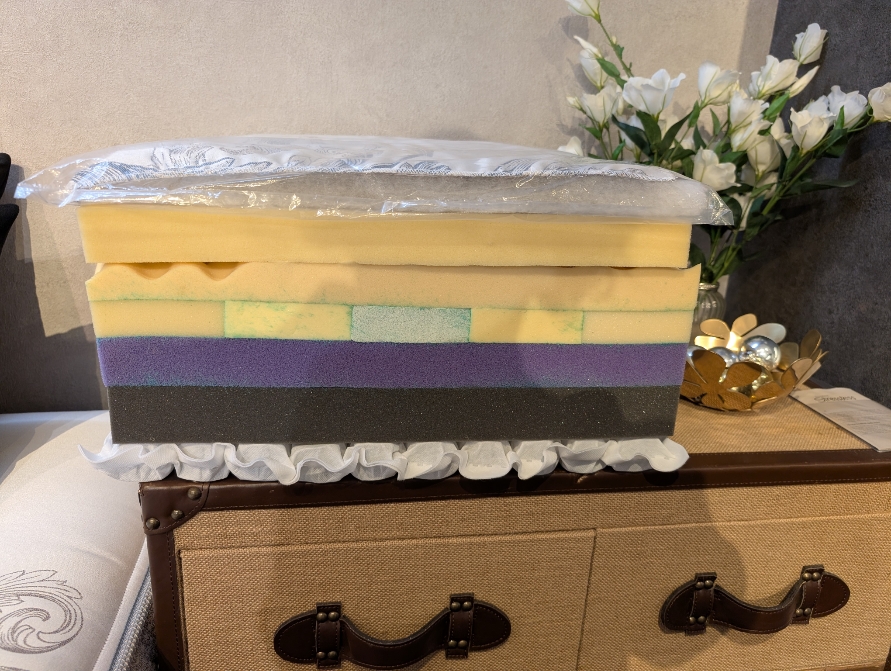 マットレスの詰め物の断面図はこんな感じで、ボリュームたっぷりです。この14層の中には独立して身体を支えてくれる3ゾーン(中央部を重点的にサポートする)薄型マイクロコイルも入っています。この3ゾーン薄型マイクロポケットコイルと詰物の5ゾーン・プレッシャーリリーフ・インレー(中央部にジェルラテックス、その両サイドに低反発、そのそとがわにウレタン)を合わせることにより必要な部分を支えつつ柔らかな感触をかなえています。