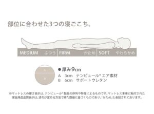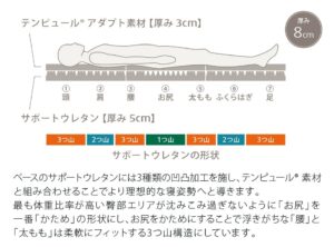 軽量化を実現したテンピュールアダプト素材とサポートウレタンの2層を組合わせ軽やかな心地よさを実現。7つのゾーンに合わせてサポートウレタンを波形に変え、サポート力をアップしたものです!【プロ エア フトン】に比べ1㎝薄いタイプですが、寝心地は軽く、寝返りが打ちやすいです。耐久性のあるサポートウレタンが使われているので、底付き感も感じにくいです。一番荷重のかかる腰の部分は硬めに設計されているので、腰が落ち込むのを避け正しい寝姿勢をサポートしてくれます。マルチに使えて、寝心地がバツグン!あると便利な1枚です!