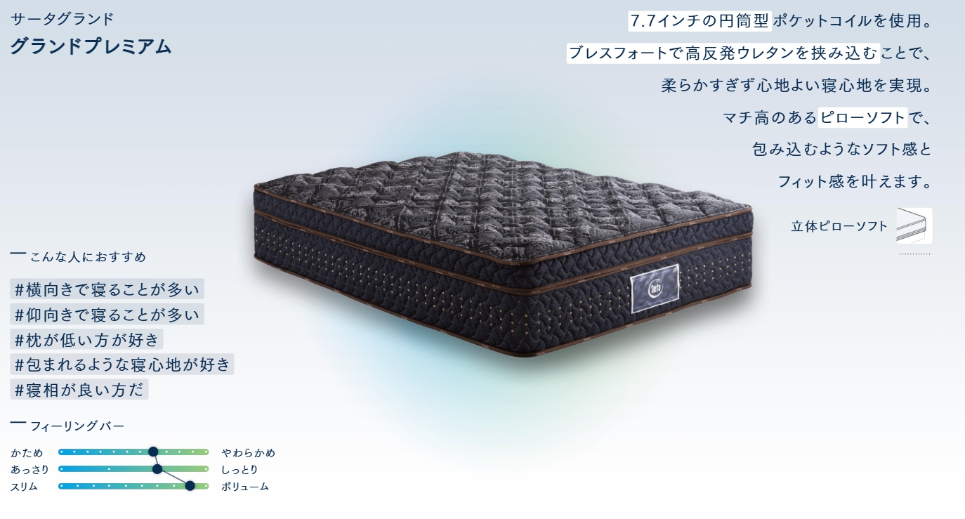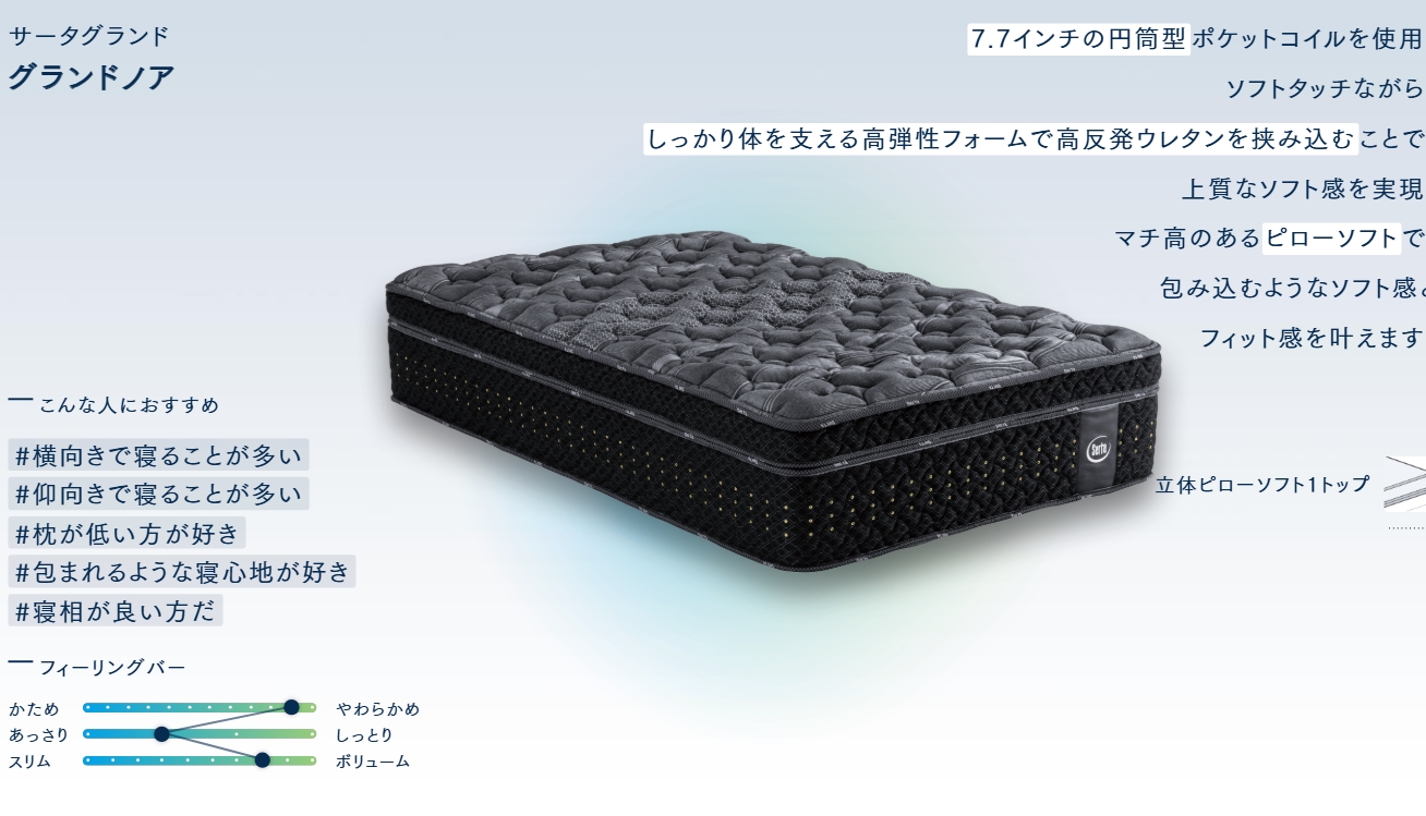 サータのグランドシリーズは、いずれも7.7インチの円筒型ポケットコイルを採用し、5ゾーン超高集積の配列できめ細やかなフィット感と上質なクッション性を実現しています。その上でマットレスの寝心地を左右する詰め物にそれぞれ異なる高機能素材を使用している点が大きな違いです。