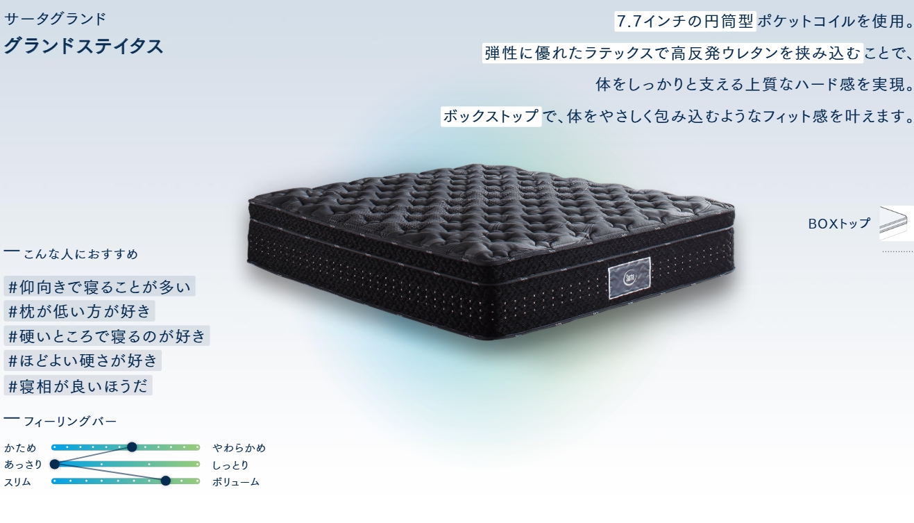 1.グランドステータス:高い反発力と衛生面を重視するグランドシリーズの中では「硬め」になります。
