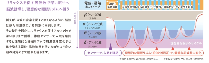 電位・温熱治療で体を整えながら、体動センサーで眠りを感知し、深い入眠を促し理想的なリズムで睡眠を導いてくれる、ぐっすりモードをプラス!!