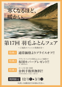 ☆只今開催中の羽毛ふとんフェア【12/1(月)~3/18(日)】では、3つの特典をご用意しております♪