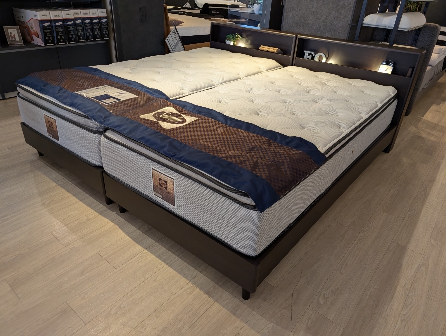 ふんわり包まれる様な寝心地を味わえるマットレス(左右でマットレスの硬さ厚みが若干違います)に当店オリジナルフレームを付けて、シングル2台セットでメーカー希望価格¥372,500を展示品限り51%OFの¥179,900!!