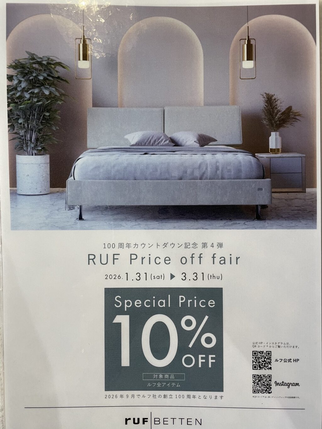 今日は、現在開催中の【100周年カウントダウン記念! RUF Price off fair】についてご紹介いたします!