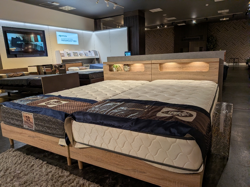 こちらもマットレスはシーリー!!フレームは当社オリジナルフレームで2台セットでメーカー希望価格¥224,000のところ展示品大特価で¥129,900!!