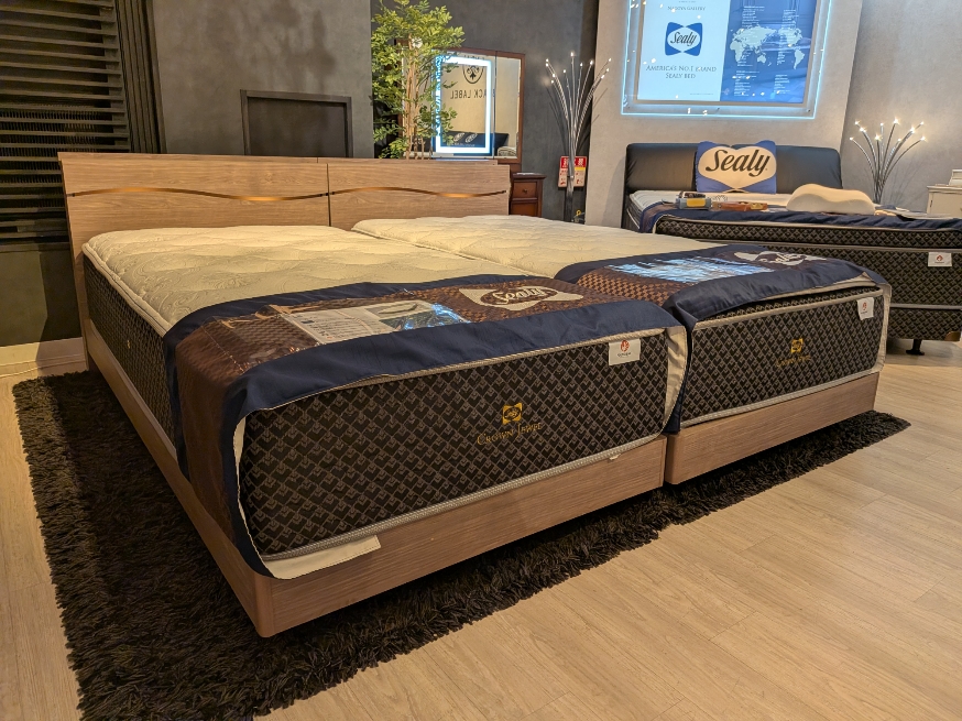 こちらは、シーリーのクラウンジュエルの「クリスタルⅣ」「エメラルドⅣ」を1枚ずつ、フレームはシーリー社製のサシェキャビ2台セットで、メーカー希望価格¥788,700のところを展示処分大特価¥399,900 なんとメーカー希望価格の49%OFFでご提供!!