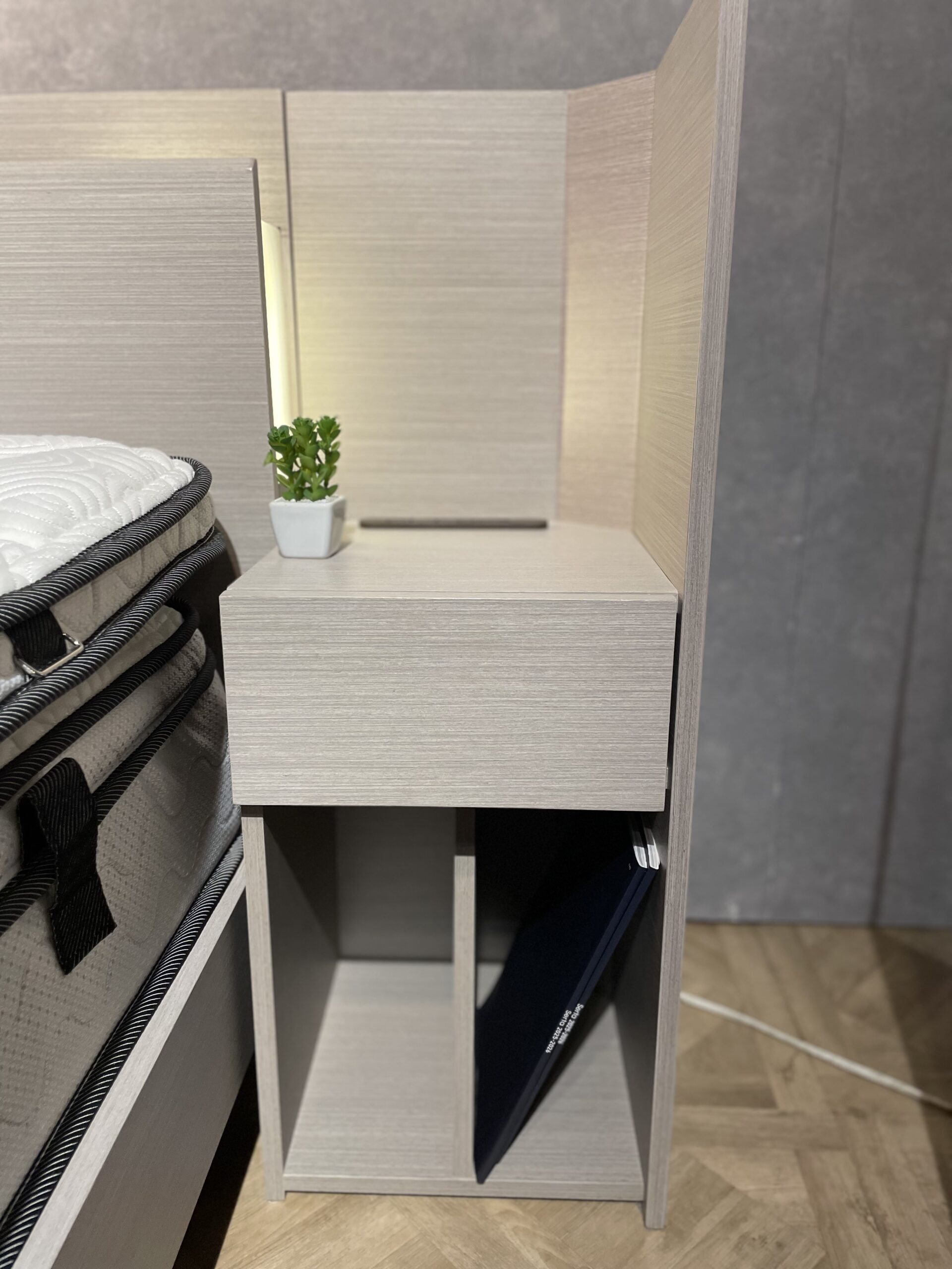 さらに両サイドにナイトテーブルを付ければ、本やドリンクなど必要な物を手の届くところにまとめることができて便利♪