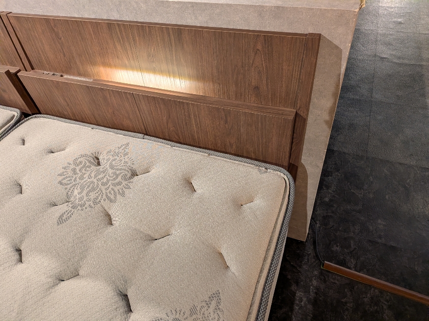 ヘッドボードにほんのりとライトが付いて、シート張りですが高級感を感じさせます!