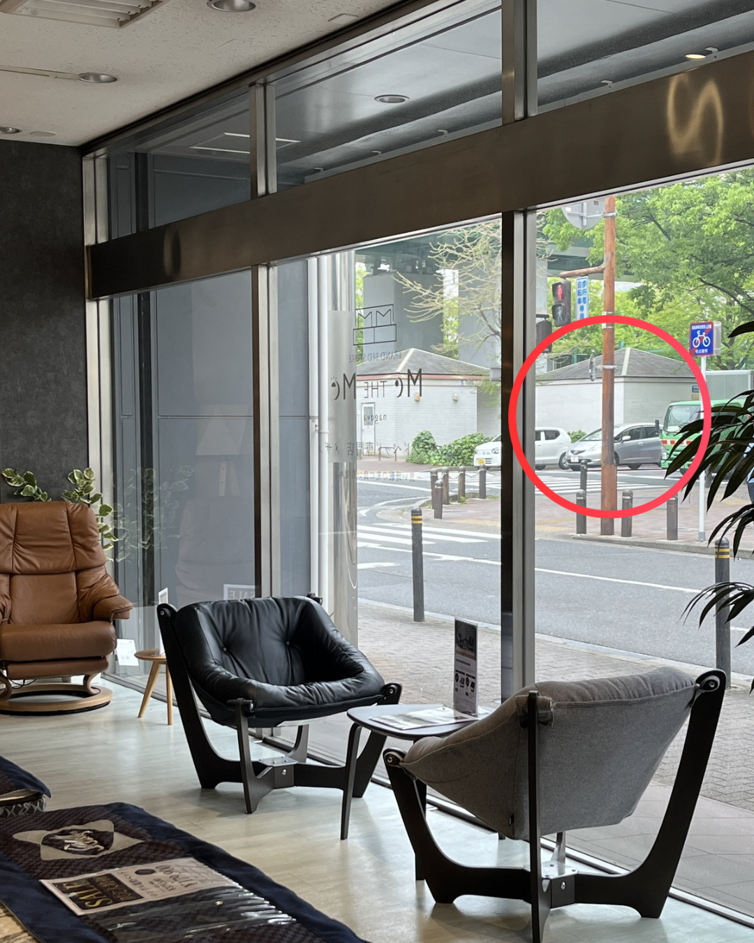 店内からの写真↓↓ 赤丸で囲っている建物が、地上へのエレベーターになります☆