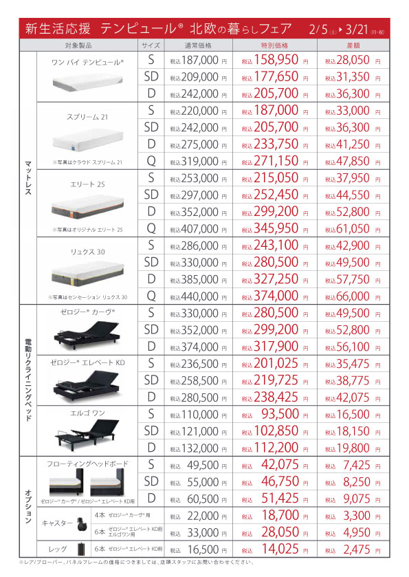 テンピュール® 新生活応援 北欧の暮らしフェアは、お好みの硬さ、サイズなどをお選び頂きお取り寄せでもかなりお得!!