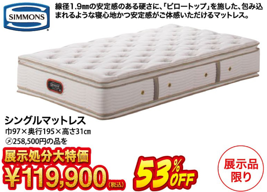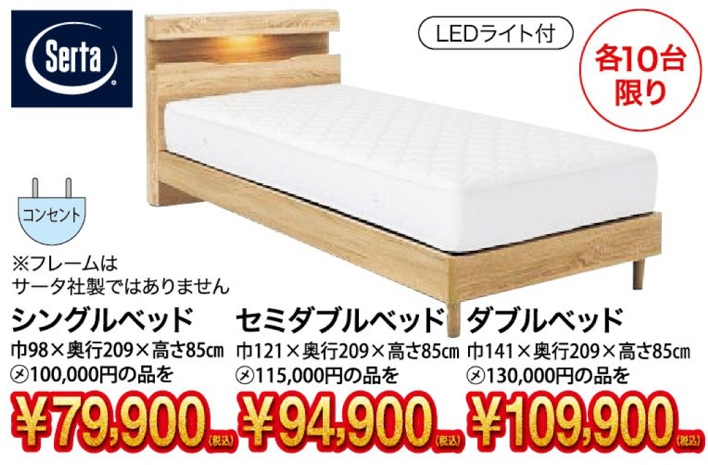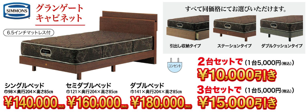 シーリー、シモンズ、サータ、テンピュール、日本ベッド、ドリームベッド、ルフ、アンネルベッド、パラマウントベッド、ウォーターベッド、フランスベッド、スターンズ&フォスター (※都合によりお取り扱いメーカーは変更されることがございます。予めご了承くださいませ )