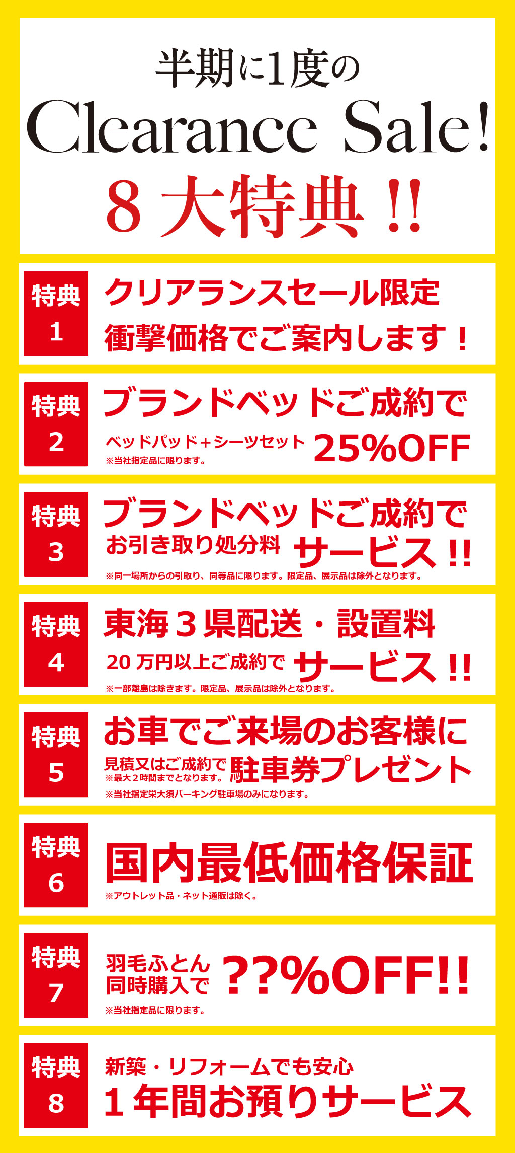 2026年3月9日(土)~4月5日(日)の期間、「半期に一度のクリアランスSALE!!」を開催いたします。是非この機会に一度ご来店の上、極上の寝心地をご体感下さい。
