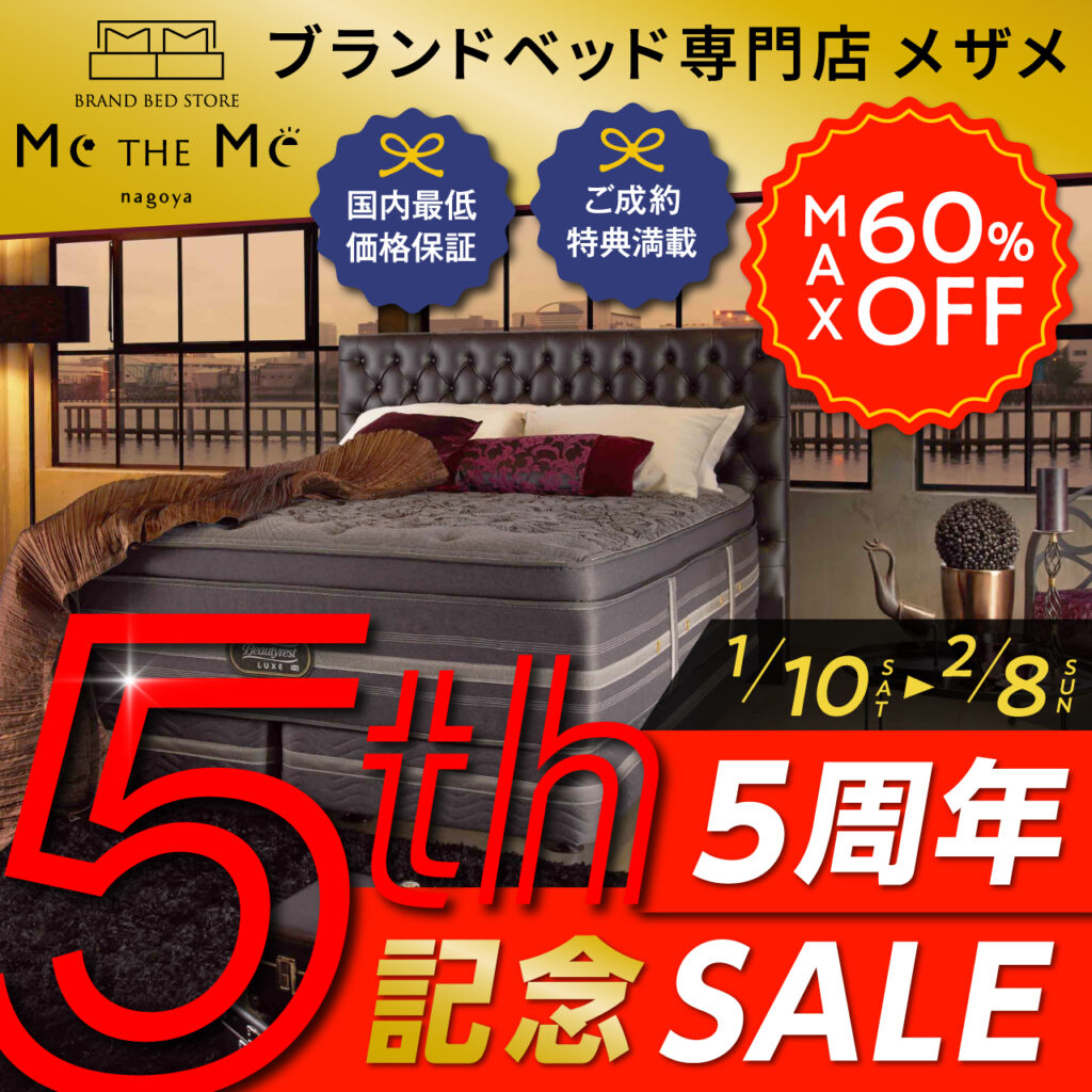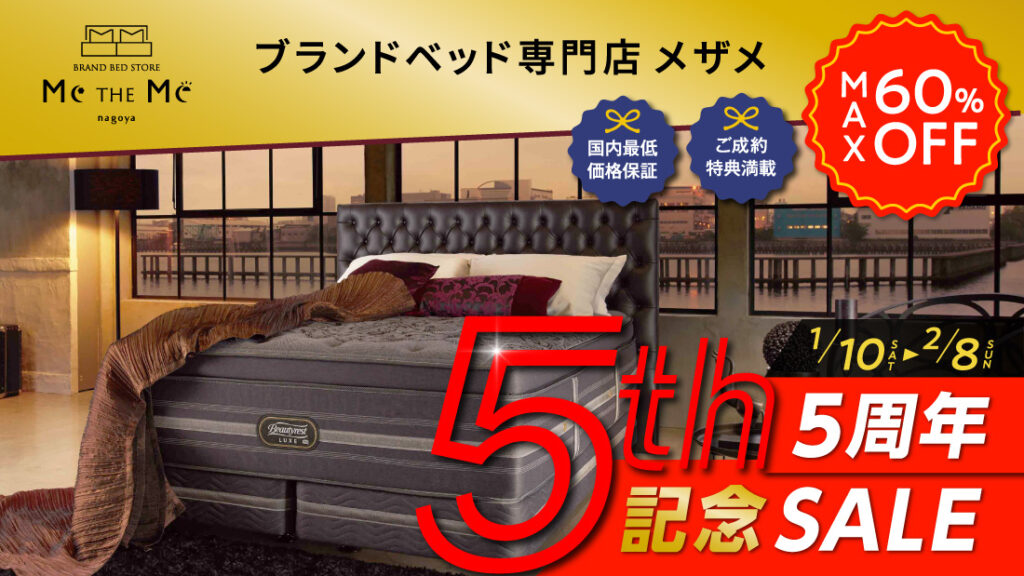 2026年1月10日(土)~2月8日(日)の期間、「5周年記念SALE!!」を開催いたします。是非この機会に一度ご来店の上、極上の寝心地をご体感下さい。